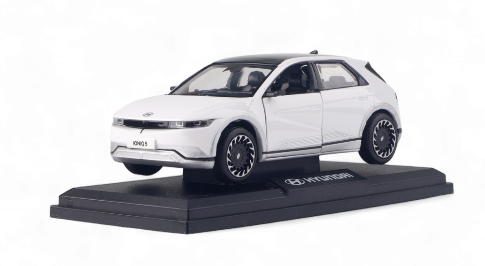 Якісна та оригінальна модель автомобіля Hyundai Ioniq 5 виконана в масштабі 1:38. Передні двері авто відчиняються. Модель виконана з металу та встановлена на пластикову підставку з логотипом Hyundai. Не є іграшкою для дітей.