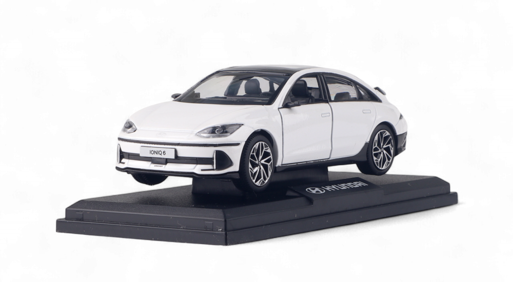 Якісна та оригінальна модель автомобіля Hyundai Ioniq 6 виконана в масштабі 1:38. Передні двері авто відчиняються. Модель виконана з металу та встановлена на пластикову підставку з логотипом Hyundai. Не є іграшкою для дітей.